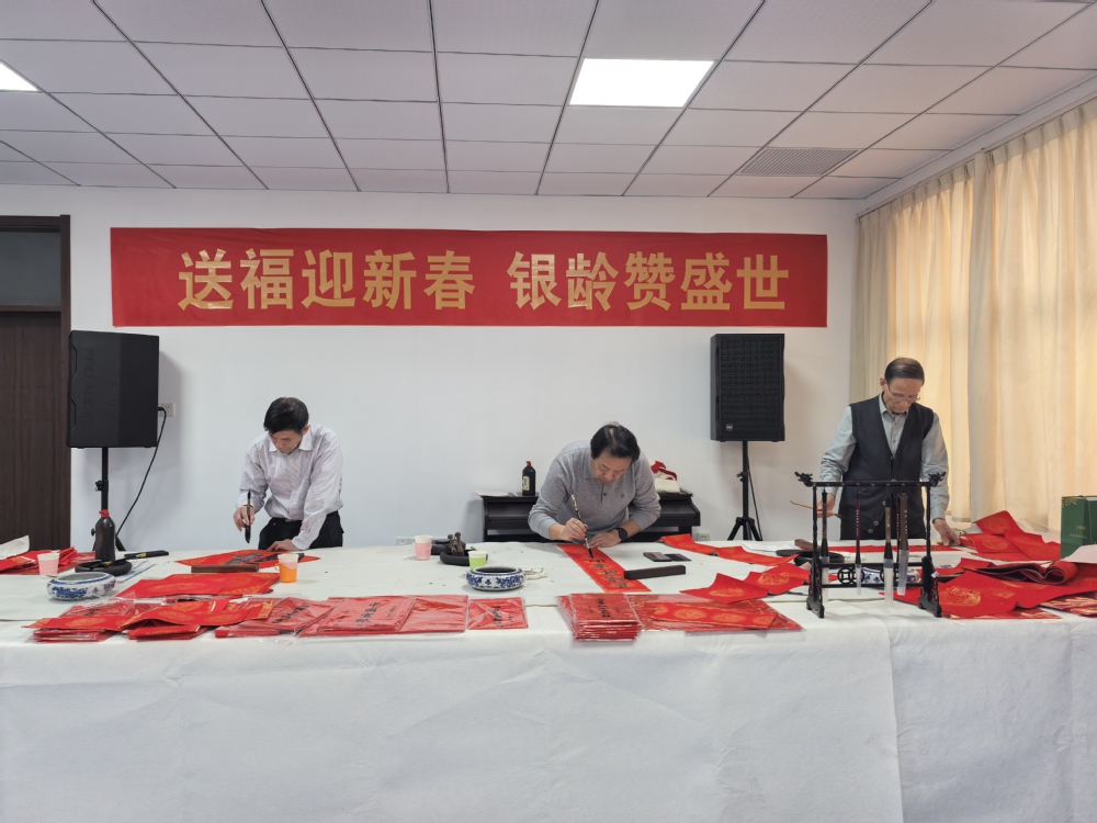活动现场暖意融融、喜气洋洋。老同志们精心构思、量身创作定制化春联,既有彰显初心使命、扎根基层的励志联,也有饱含民生福祉、产业兴旺的吉祥联。同时,老同志们还为当地村民书写了大量通用福字与新春楹联,鲜艳的红纸搭配苍劲的墨字,勾勒出浓郁的新春气息,村民们纷纷驻足观赏、有序领取,现场处处洋溢着喜庆祥和的节日氛围。